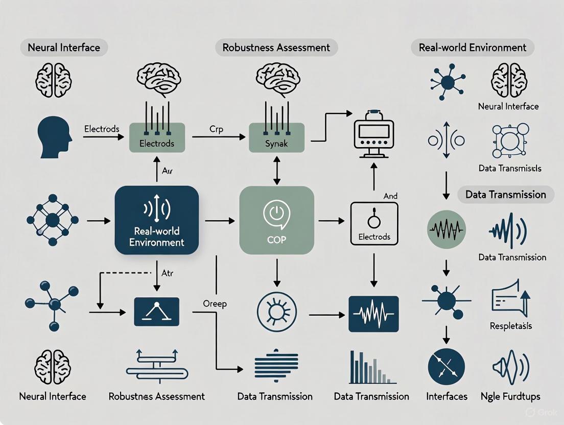 This article provides a systematic review of strategies for evaluating and enhancing the robustness of neural interfaces in real-world environments. Tailored for researchers, scientists, and drug development professionals, it bridges the gap between controlled laboratory validation and the unpredictable conditions of chronic, deployed use. The scope spans from foundational principles and signal acquisition challenges to advanced methodological adaptations for signal disruption, targeted troubleshooting for biological and technical failures, and rigorous validation metrics. By synthesizing current research on flexible electrodes, automatic error detection, and adaptive machine learning, this article offers a consolidated reference to guide the development of next-generation, clinically viable brain-computer interfaces.