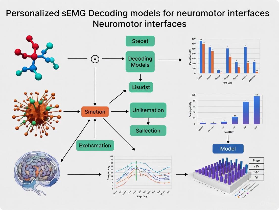 Personalized sEMG decoding represents a paradigm shift from generic models to user-centric interfaces, directly addressing the critical challenge of biological variability. The synthesis of foundational knowledge, advanced methodological frameworks like unsupervised personalization and reinforcement learning, robust optimization techniques, and rigorous comparative validation confirms that personalization is not merely an enhancement but a necessity for high-performance, real-world neuromotor interfaces. Future directions must focus on the development of fully automated, real-time adaptation pipelines that require minimal user input, the integration of multi-modal data (e.g., combining sEMG with inertial measurement units), and the expansion of clinical applications from advanced prosthetic control to personalized neurorehabilitation and drug efficacy monitoring in neuromuscular disorders. The convergence of large-scale data, sophisticated AI, and user-specific tuning heralds a new era of intuitive and accessible human-machine interaction for researchers and clinicians alike.