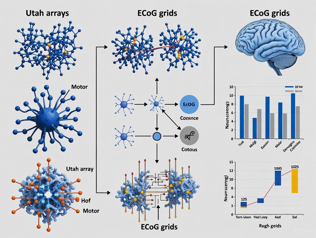 This article provides a detailed comparative analysis of two primary invasive brain-computer interface (BCI) technologies for motor decoding: Utah microelectrode arrays and electrocorticography (ECoG) grids.